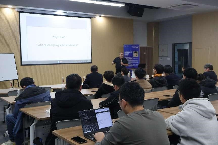 随后,Shay Gueron教授作题为“Constructions Based on the AES Round and Polynomial Multiplications, that are Efficient on Modern Processor Architectures”的报告。报告介绍了高效实现分组密码AES以及伽罗华域GF(2^n)中多项式乘法的指令集,并讨论了如何基于它们构造实际可行的、高效的密码原语或密码模式。