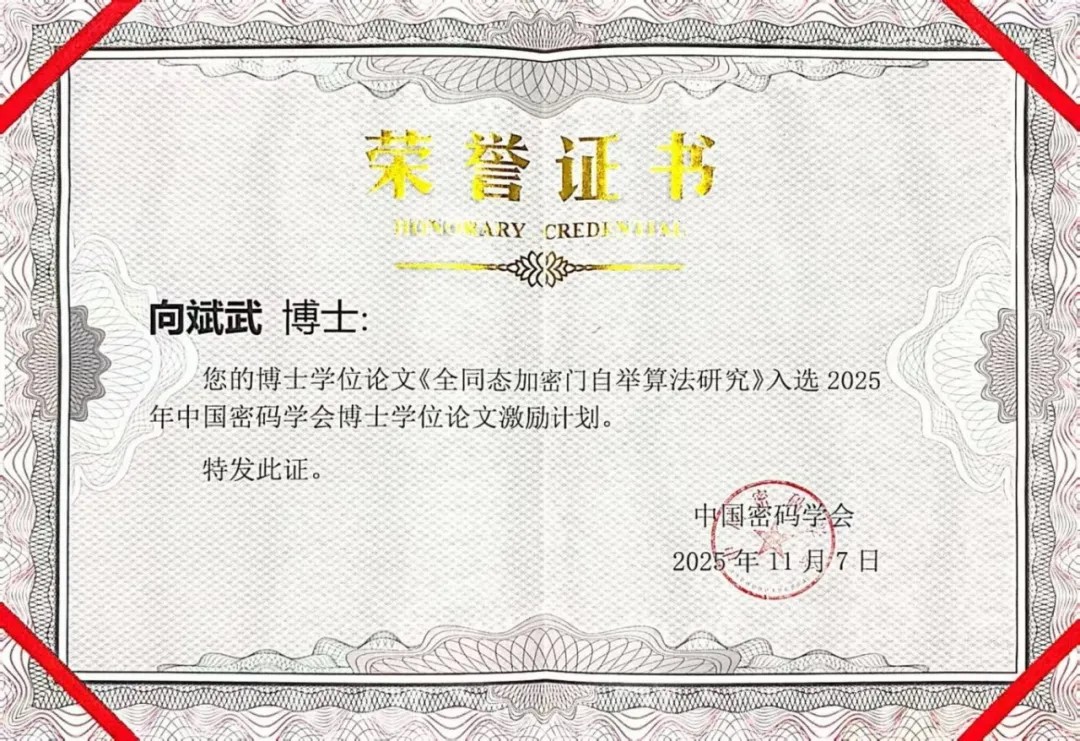 近日,第十八届中国密码学会年会在天津举办,会上颁发了2025年中国密码学会博士学位论文激励计划(原中国密码学会优秀博士学位论文奖)。经过形式审查、初评、终评,2025年全国共八篇博士学位论文入选该激励计划,其中两位获奖者李迎新、向斌武已入职华东师范大学密码学院任副教授。